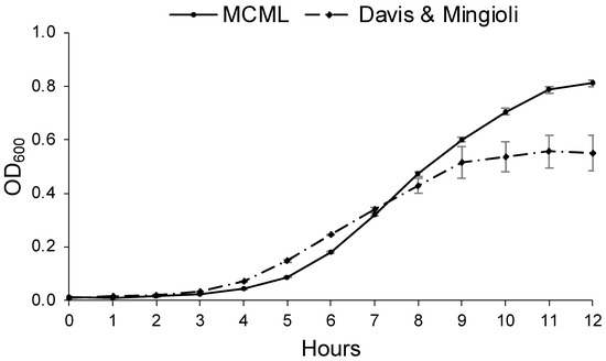 Growth curve of B. stratosphericus in MCML and Davis and Mingioli (DM) media.