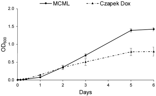 Likewise, Figure 7 shows the D. hansenii baseline growth curves cultivated in MCML (replacing the carbon source with sucrose 30.0 g L−1) and in the most yeast-specific CD; it was observed that the lag phase was <3.0 h in CD, while it was >3.0 h in MCML. The average growth rate was greater in MCML (0.65 d−1) compared to CD medium (0.49 d−1). Again, approximately two times greater total biomass was obtained in MCML compared to CD medium (1.42 ± 0.05 OD600 vs. 0.80 ± 0.13 OD600; 8.5 ± 0.1 mg mL−1 vs. 4.1 ± 0.7 mg mL−1).