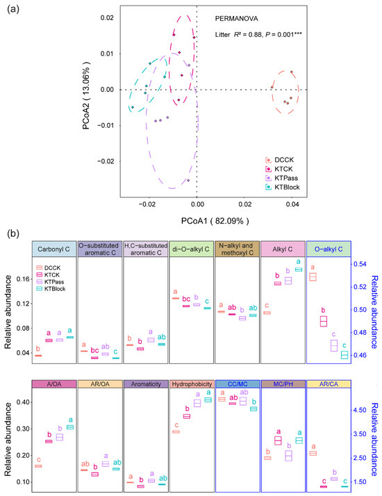 Chemical complexity (a) and initial relative abundance of organic carbon (b) before decomposition. PCoA based on the Bray–Curtis distances illustrates the complexity of the initial litter chemistry. The dot colors denote the initial litter chemistries, with dotted ellipse borders indicating 65% confidence intervals. Permutational multivariate analysis of variance (PERMANOVA) with the Bray–Curtis distance to assess the effect of initial litter chemistry on the chemical complexity (*** p = 0.001). The litter materials were classified into four distinct initial chemistries before decomposition: Deschampsia caespitosa (DCCK) and Kobresia tibetica (KTCK), both grown under ambient solar radiation (CK), and K. tibetica (KTPass and KTBlock), subjected to UV-pass and UV-block treatments, respectively. The letters indicate significant differences among the initial litter chemistries (mean ± SE, n = 5, Tukey’s HSD, p < 0.05). The organic carbon and decay indices in the black frames correspond to the left axis, while those in the blue frames correspond to the right axis.