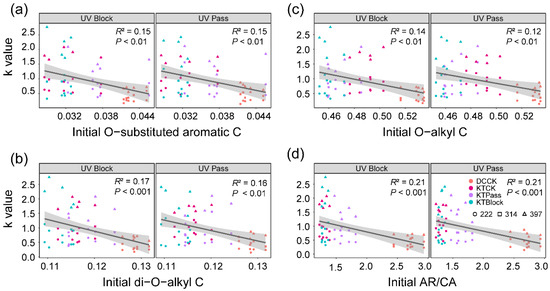 The initial relative abundance of O-substituted aromatic C exhibited negative correlations with the decay rate constant (k value) under both UV-block (R2 = 0.15, p < 0.01, Figure 3a) and UV-pass conditions (R2 = 0.15, p < 0.01, Figure 3a). Similarly, negative associations were observed between the initial relative abundance of di-O-alkyl C and the k value under both UV-block (R2 = 0.17, p < 0.001, Figure 3b) and UV-pass conditions (R2 = 0.16, p < 0.01, Figure 3b). Additionally, the initial relative abundance of O-alkyl C showed negative correlations with the k value under both UV-block (R2 = 0.14, p < 0.01, Figure 3c) and UV-pass conditions (R2 = 0.12, p < 0.01, Figure 3c). Furthermore, the initial ratio of aromatic C to carbonyl C (AR/CA) negatively correlated with the k value under both UV-block (R2 = 0.21, p < 0.001, Figure 3d) and UV-pass conditions (R2 = 0.21, p < 0.001, Figure 3d). However, no significant relationship was found between the initial abundance of the litter’s chemical composition and the effect of UV radiation on the litter mass loss (Table S3).