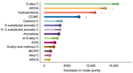 Relative contribution of the decay indices based on the chemical composition to the litter mass loss. Random forest regression analysis was conducted on the organic carbon abundances from decomposing litter. The importance of variables was assessed by the increase in node purity, with higher values indicating greater importance (* p < 0.05).