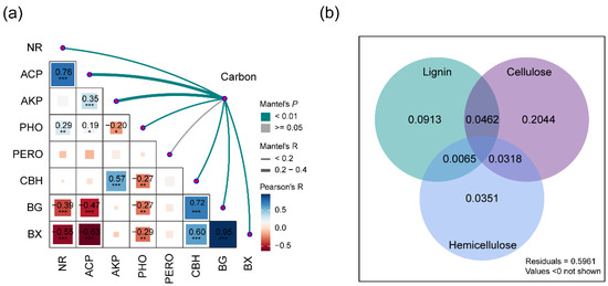 Mantel tests and variance partitioning analysis (VPA) of the litter’s chemical complexity and soil enzyme activities. (a) Mantel tests show relationships, with the edge width proportional to the Mantel’s R value and the edge color indicating statistical significance. Pairwise correlations are depicted with a color gradient representing Pearson’s correlation coefficients. The numbers represent significant Pearson correlation coefficients. The enzyme activities include cellobiohydrolase (CBH), β-1,4-glucosidase (BG), β-1,4-xylosidase (BX), phenol oxidase (PHO), peroxidase (PERO), acid phosphatase (ACP), alkaline phosphatase (ALP), and nitrate reductase (NR). (b) VPA illustrates the proportion of the variation in the litter’s chemical complexity explained by environmental variables. The shades represent the combined effects of environmental variables on the variation in the litter’s chemical complexity. The extracellular enzyme activities are categorized by their role in degrading lignin (PHO, PERO), cellulose (CBH, BG), and hemicellulose (BX). Significance levels are as follows: *** 0.001, ** 0.01, * 0.05.