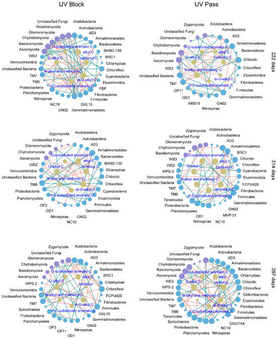 Bipartite networks between the litter’s organic carbon (C) and the soil microorganisms in the UV radiation attenuation treatments during decomposition. The bode colors indicate taxonomic groups at the phylum level (blue and purple nodes for bacteria and fungi phyla) and litter organic C (yellowish–brown nodes for 13C NMR-based C types). The node sizes reflect the node degree, with larger nodes indicating higher degrees. The line colors represent significant positive (green) and negative (red) relationships between the soil microorganisms and the litter’s chemistry.