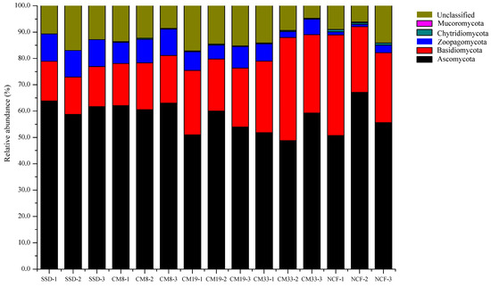 3.3. Taxonomic Compositions of Soil Fungal Communities across Plantation Development