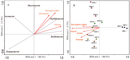 4.3. Relationship between Soil Fungal Community and Soil Factors
