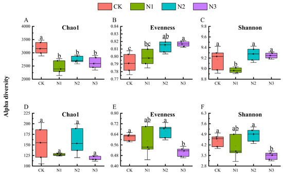 Chao1 richness, evenness, and Shannon indices for bacterial (A–C) and fungal (D–F) communities in N fertilizer treatments (mean ± SE). CK, no fertilizer control; N1, 280 N kg ha−1; N2, 560 N kg ha−1; N3, 840 N kg ha−1. Different letters indicate significant differences among treatments.
