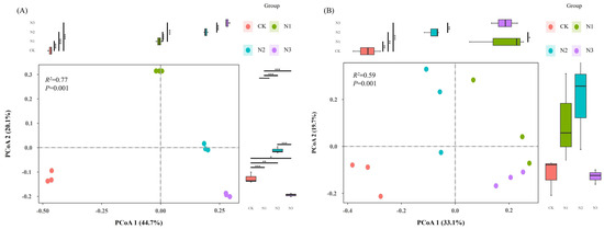 The β-diversity of microbial communities formed four clusters by the PCoA of weighted UniFrac distance and changed strongly after nitrogen fertilizer application (Figure 2). The explanatory degree of nitrogen fertilizer levels on the β-diversity of bacterial and fungal communities was calculated as 64.8% and 52.80%, respectively. More specifically, the explanatory degree of the first and second axes of bacterial β-diversity was calculated as 44.70% and 20.10%, and the explanatory degree of the first and second axes of fungal β-diversity was calculated as 33.10% and 19.70%, respectively. Furthermore, with increasing nitrogen fertilizer levels, bacterial β-diversity showed an increasing trend, but an opposite trend in fungal β-diversity was measured (Figure S2).