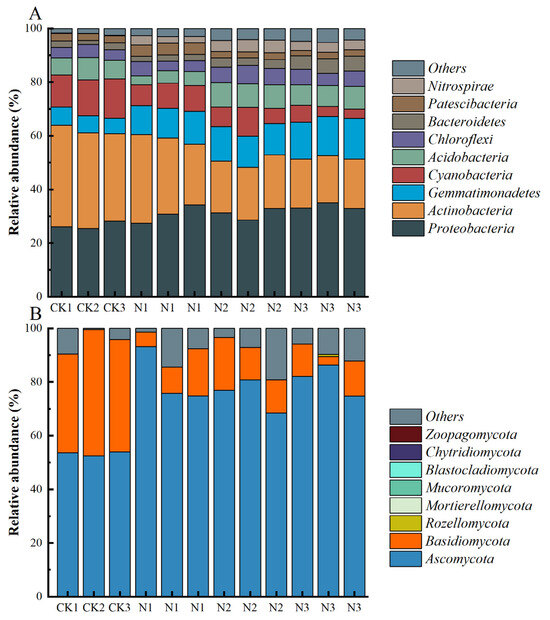 Taxonomic composition of soil bacterial (A) and fungal (B) communities at the phylum level in N fertilizer treatments. The top nine bacterial phyla and the top eight fungal phyla with the highest relative abundance are presented in the stacked column charts. CK, no fertilizer control; N1, 280 N kg ha−1; N2, 560 N kg ha−1; N3, 840 N kg ha−1.