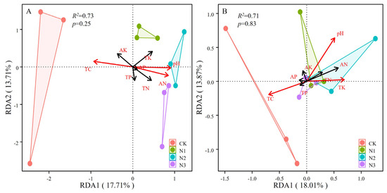 Relationships between the soil chemical properties and the bacterial (A) and fungal (B) communities. CK, no fertilizer control; N1, 280 N kg ha−1; N2, 560 N kg ha−1; N3, 840 N kg ha−1.