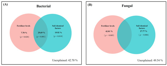 The relationships between soil microbial communities and soil chemical properties were analyzed using RDA (Figure 4). The top two RDA factors explained 31.42% of community variation in bacterial communities and 31.88% in fungal communities, and the key chemical properties of purple mudstone weathering products for bacterial communities (pH, R2 = 0.82, p < 0.05; TC, R2 = 0.88, p < 0.01; AN, R2 = 0.76, p < 0.01) and fungal communities (pH, R2 = 0.56, p < 0.05; TC, R2 = 0.46, p < 0.05; TK, R2 = 0.47, p < 0.05) were calculated using the post hoc test of PERMANOVA (Table S3). Meanwhile, RDA results also confirmed that the effects of the chemical properties of purple mudstone weathering products on bacterial communities (R2 = 0.73) were slightly greater than those on fungal communities (R2 = 0.71) in this study (Figure 4). Furthermore, the VPA indicated that nitrogen fertilizer application explained 57.30% of the variation in bacterial communities, including fertilizer levels (7.70%) and soil chemical properties (19.92%) (Figure 5A), and 50.46% of the variation in fungal communities, including fertilizer levels (42.01%) and soil chemical properties (27.77%) (Figure 5B).