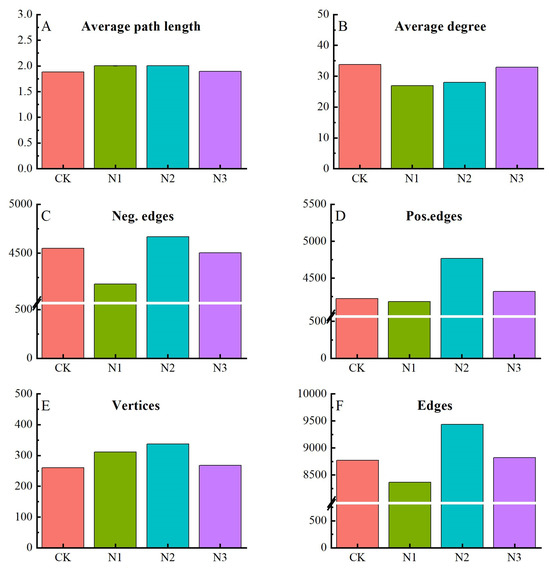 Characteristics of microbial co-occurrence networks. Average path length (A), average degree (B), negative edges (C), positive edges (D), vertices (E), and edges (F). CK, no fertilizer control; N1, 280 N kg ha−1; N2, 560 N kg ha−1; N3, 840 N kg ha−1.