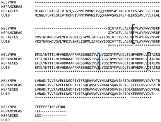 Clustalw alignment of the 3c proteins obtained from different samples collected from the same individual (M3) showing identical amino acids in the same positions for the coronavirus sequences compared with the coronavirus strain UU19. The “*” at the bottom shows where the aminoacids are identical in all the samples; the “:” indicates the positions where there are differences between aminoacids of the analyzed samples. The “*” in the sequence of aminoacids indicates a stop codon. The “-” was used when no aminoacid was available (due to deletions). The box indicates the amino acids of interest for the 3c protein analyses.