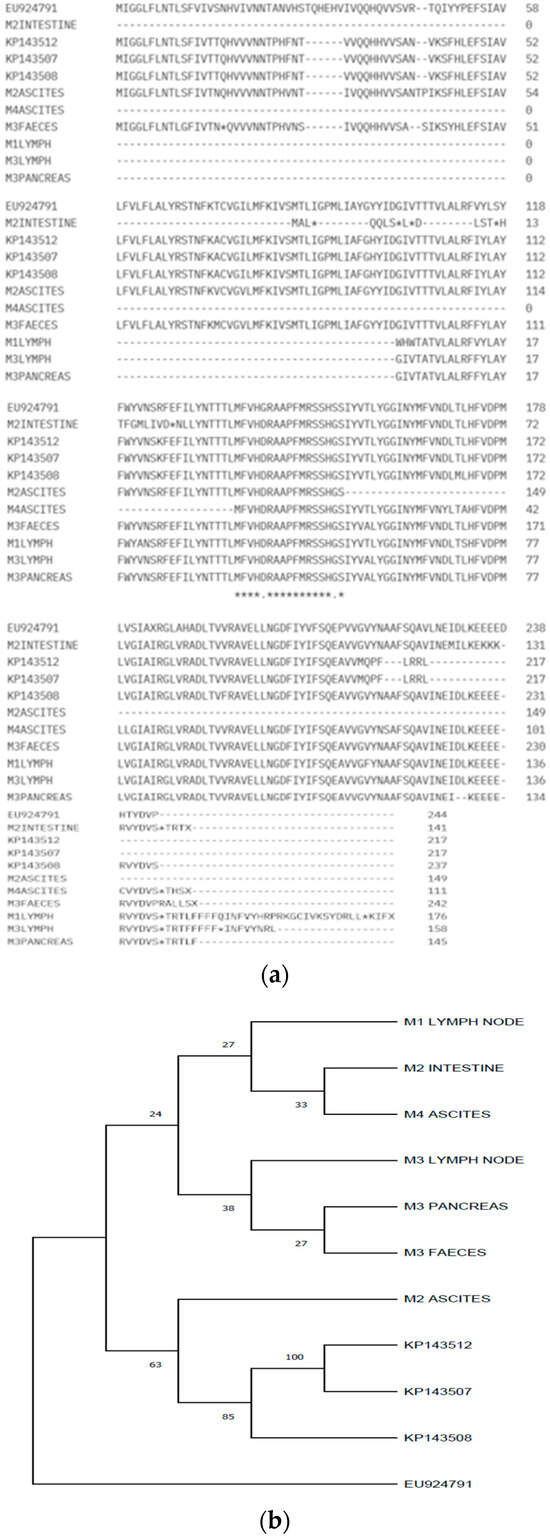 In order to amplify the 3c gene in the samples that were positive for real-time RT-PCR, several pairs of primers were used. RT-PCR showed positive results for ten samples: two effusions (M2 and M4), three mesenteric lymph nodes (M1, M3, and M4), three small intestine (M2–M4) samples, and one pancreas (M3) and one faecal sample (M3) (Table 3). The 3c amplicons sequenced in order to obtain the corresponding nucleotide sequences succeeded for the cat M1 lymph node, cat M2 ascites and small intestine, cat M3 pancreas, faeces and lymph node, and cat M4 ascites. The sequencing failed for the rest of the 3c amplicons.
