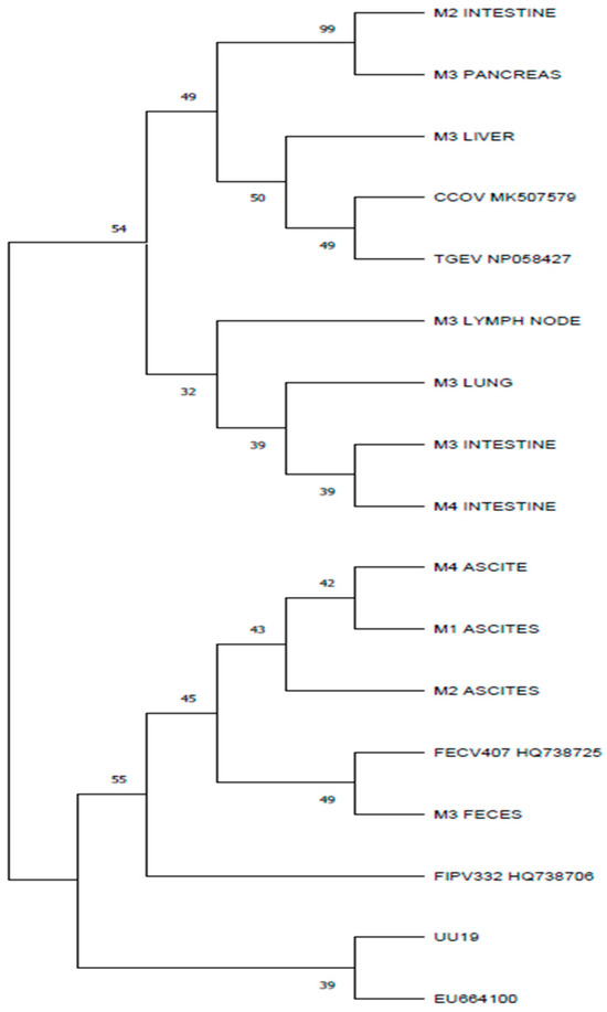 For cat M4, the sequencing succeeded only for the ascites sample, where 390 bases were obtained (25,496–25,885) at the 3′ end of the 3C protein. There were 16 mismatches and three deletions in the amplified M4 ascites virus when compared with the UU19 strain. The phylogenetic analysis (Figure 2) shows the diversity of the strains that appeared due to mutations.
