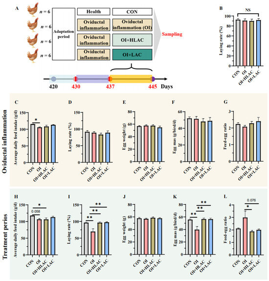 Figure 1. Effects of Lactobacillus crispatus on the laying performance of laying hens. (A) Experimental design. The experiment was conducted in three phases: first, a 10-day adaptation period; second, a 7-day period for the oviductal inflammation model creation, with the control (CON) group receiving sterile saline and the oviductal inflammation (OI), OI + heat-killed Lactobacillus crispatus (HLAC), and OI + Lactobacillus crispatus (LAC) groups receiving daily inflammation-inducing drugs; and third, an 8-day treatment period during which the CON and OI groups were administered 1 mL of MRS broth daily using gavage, the OI + LAC group received fresh Lactobacillus crispatus (1 × 109 CFUs mL−1), and the OI + HLAC group received heat-killed Lactobacillus crispatus (1 × 109 CFUs mL−1), all administered in equivalent volumes using gavage once a day. (B) Average laying rate of laying hens during the adaptation period. (CG) Average daily feed intake (C), laying rate (D), egg weight (E), egg mass (F), and feed–egg ratio (G) of laying hens during oviductal inflammation period. (HL) Average daily feed intake (H), laying rate (I), egg weight (J), egg mass (K), and feed–egg ratio (L) during the treatment phase. Data are expressed as means ± SEMs (n  =  6). * p < 0.05, ** p < 0.01.