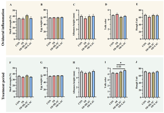 As shown in Figure 2, there were no significant differences among the groups in terms of the shell strength, egg weight, albumen height, yolk color, or Haugh unit during the oviductal inflammation period (p > 0.05) (Figure 2A–E). During the treatment period, the yolk color of the OI + LAC group was higher (p < 0.01) than that of the OI group during the treatment period (Figure 2I). In addition, the yolk color of the LAC group was higher than that of the control (p = 0.05) (Figure 2I). However, no significant differences were observed in terms of the shell strength, egg weight, albumen height, and Haugh unit (p > 0.05) (Figure 2F–H,J).