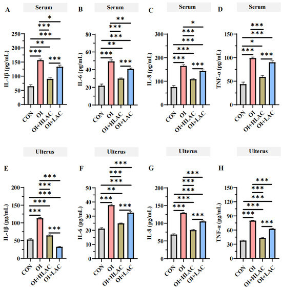 As shown in Figure 4, the IL-1β, IL-6, IL-8, and TNF-α concentrations were significantly elevated in the serum and uterine tissues of the OI group compared to those in the CON (control), OI + LAC, and OI + HLAC groups (p < 0.001). Specifically, the IL-1β, IL-6, and IL-8 levels in the serum and uterine tissues were notably higher in the OI group than those in the OI + LAC and OI + HLAC groups (p < 0.05). Additionally, the TNF-α levels in the uterine tissue were significantly greater in the OI group compared to those in the OI + LAC and OI + HLAC groups (p < 0.001). When compared to the CON group, the OI group exhibited significantly higher = IL-1β, IL-6, IL-8, and TNF-α levels in the uterine tissue (p < 0.001). Crucially, these levels significantly decreased in the OI + LAC group when compared to the OI group (p < 0.001). Furthermore, the IL-1β, IL-6, IL-8, and TNF-α levels in the uterine tissue were significantly reduced in the OI + LAC group compared to those in the OI + HLAC group (p < 0.001).