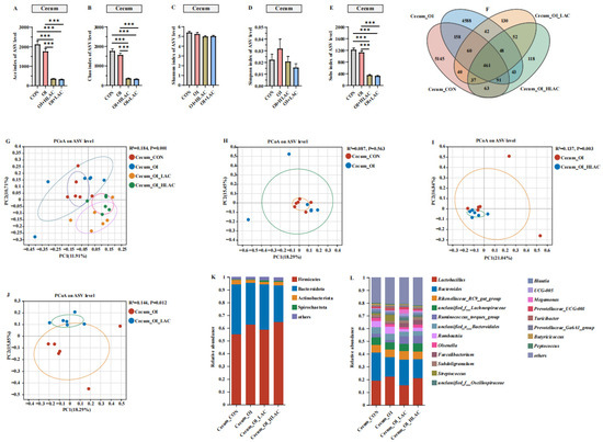 Figure 6. Effects of Lactobacillus crispatus on cecum microbiota in laying hens during oviductal inflammation. (AE) Measures of five alpha diversity metrics (Ace, Chao, Shannon, Simpson, and Sobs indices) in laying hen ceca. (F) Venn diagram illustrating Amplicon Sequence Variant (ASV) overlap. (GJ) Principal coordinate analysis (PCoA) plots based on weighted UniFrac distances depicting microbiota similarity across different groups. (K) Chart detailing average distribution of major phyla within cecal microbiota. (L) Chart presenting average proportion of predominant genera in cecal microbiota. Data are expressed as means ± SEMs (n  =  6). *** p < 0.001.