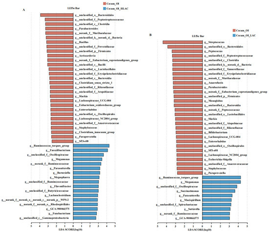 Figure 7. Effects of Lactobacillus crispatus on differential cecal microbes in laying hens during oviductal inflammation. (A) The linear discriminant analysis (LDA) effect size (LEfSe) analysis of the cecum microbiota between Cecum_OI (red) and Cecum_OI_HLAC (blue) groups at the genus level. (B) The LEfSe analysis of the cecum microbiota between Cecum_OI (red) and Cecum_OI_LAC (blue) groups at the genus level.