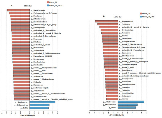 Figure 9. Effects of Lactobacillus crispatus on differential uterine microbes of laying hens during oviductal inflammation. (A) The LEfSe analysis of the uterine microbiota between Uterus_OI (red) and Uterus_OI_HLAC (blue) groups at the genus level. (B) The LEfSe analysis of the uterine microbiota between Uterus_OI (red) and Uterus_OI_LAC (blue) groups at the genus level.