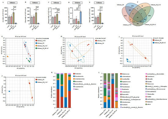 As shown in Figure 10, all of the alpha diversity indices for the OI + HLAC and OI + LAC groups showed significant differences (p < 0.001). Additionally, the observed Simpson index was the highest, and the Ace, Chao, Shannon, and Sobs indices were the lowest in the OI + LAC group. The shared and unique ASV proportions in the four groups are intuitively indicated in the Venn diagram in Figure 10F. There were 52 shared ASVs contained in the CON, OI, OI + HLAC, and OI + LAC groups; the numbers of unique ASVs were 1024, 1054, 2599, and 63, respectively. At the phylum level (Figure 10K), the results show that Firmicutes was the most abundant bacteria in the CON, OI, and OI + HLAC groups, whereas Actinobacteriota was the most abundant bacteria in the OI + LAC group. At the genus level (Figure 10L), Rhodococcus was the most abundant genus in the OI + LAC group. PCoA based on weighted UniFrac distances was utilized to measure the b-diversity. The PCoA results show the separation of the isthmic microbial communities between the CON and OI groups, and between the OI and OI + LAC groups, while the isthmus microbiota were aggregated in the CON and OI groups. According to the LEfSe analysis, in the OI group (Figure 11A), Achromobacter and Pedobacter were the characteristic bacteria, whereas in the OI + HLAC group, Acinetobacter, Romboutsia, Gordonia, Thiobacillus, Turicibacter, Paracocus, Bacillus, Ralstonia, Brevundimonas, Clostridium_sensu_stricto_1, and Sphingomonas were more characteristic. Pedobacter, Lactobacillus, Staphylococus, Romboutsia, Corynebacterium, and Olsenella were the characteristic bacteria in the OI group (Figure 11B), whereas in the OI + LAC group, Rhodococcus, Ochrobactrum, Delftia, OLB8, and Ralstonia were more distinctive.
