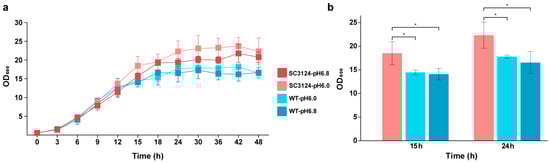 Growth of E. coli strains in 1.3 L parallel bioreactor under different pH conditions. (a) Growth curves of E. coli strains under different pH conditions. E. coli MG1655 carrying synthetic acid-tolerance module SC3124, and E. coli MG1655 are represented as SC3124 and WT, respectively. (b) The results of the statistical analysis of E. coli growth under different pH conditions at 15 h and 24 h. Each experiment was performed in three biological replicates. * Represents significance (p < 0.05).