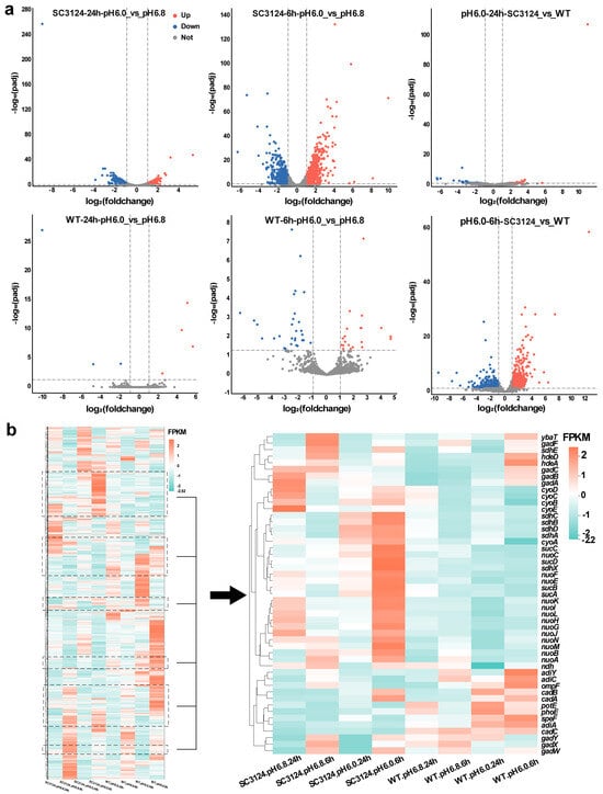 Differential gene expression analysis was performed using DESeq2 software v1.38.3 [23] and R Studio v4.2.2. For the samples with three biological replicates, genes with a q-value (adjusted p-value) < 0.05 and |log2(foldchange)| > 1 were considered differentially expressed and were visualized using a volcano plot (Figure 2a). Specifically, at pH 6.0, E. coli SC3124 displayed a robust response, with 571 and 208 genes upregulated and 525 and 310 genes downregulated at 6 and 24 h, respectively, compared to the neutral pH 6.8 condition. In contrast, the WT strain showed a more muted response, with only 20 and 4 genes upregulated and 30 and 3 genes downregulated under the same acidic conditions at 6 and 24 h. When comparing SC3124 to the WT at pH 6.0, we observed a significant reshuffling of gene expression, with 499 and 35 genes downregulated and 481 and 91 genes upregulated in SC3124 at 6 and 24 h, respectively. These results showed that mild acid treatment resulted in more significant differences in gene expression in E. coli SC3124.