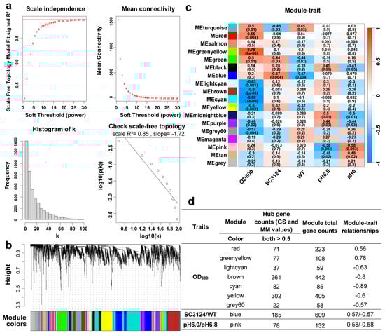 Hub genes within modules are likely critical and representative of the module’s function in a network. Genes with GS and MM values > 0.5 were defined as hub genes in their respective modules. The WGCNA modules, related traits, eigengene counts, and hub genes are summarized in Figure 3d. The red and green-yellow modules were highly positively correlated with the OD600 trait, whereas the brown, cyan, yellow, and grey60 modules were highly negatively correlated with the OD600 trait. Only the blue module was highly associated with the SC3124 and WT traits, but the opposite trend was observed. Similarly, only the pink module was highly positively and negatively correlated to the pH 6.0 and pH 6.8 trait, respectively.