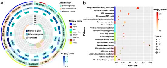 The enriched GO terms for the red and green-yellow modules that were highly positively associated with the OD600 trait were organic acid catabolic process (GO:0016054), iron-sulfur cluster assembly (GO:0016226), metallosulfur cluster assembly (GO:0031163), and molybdopterin cofactor biosynthetic process (GO:0032324) (Figure 4a). The enriched KEGG pathways for the two modules were ascorbate and aldarate metabolism (eco00053), phenylalanine metabolism (eco00360), the sulfur relay system (eco04122), nucleotide excision repair (eco03420), and folate biosynthesis (eco00790). In the lightcyan, brown, cyan, yellow, and grey60 modules, which were negatively associated with the OD600 trait, the enriched GO terms were anaerobic respiration (GO:0009061), response to copper ion (GO:0046688), biotin biosynthetic process (GO:0009102), histidine biosynthetic process (GO:0000105), obsolete plasma membrane part (GO:0044459), and glycolytic process (GO:0006096); and the enriched KEGG pathways included the two-component system (eco02020), biotin metabolism (eco00780), fructose and mannose metabolism (eco00051), histidine metabolism (eco00340), and glycolysis/gluconeogenesis (eco00010) (Figure 4b).