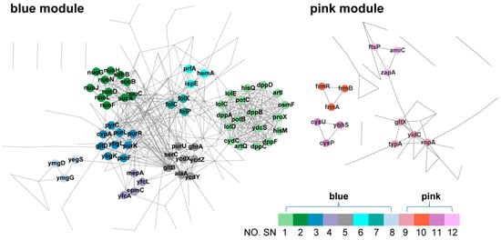 Protein–protein interaction (PPI) analysis was performed to deeply explore the internal characteristics of the interesting gene modules. We focused on the differential expression of the genes between E. coli SC3124 and WT under acidic and neutral pH conditions. Thus, the hub genes of the blue module, which was highly associated with SC3124/WT traits, and the pink module, which was highly associated with pH 6.0/pH 6.8 traits, were employed for PPI analysis. The predicted functional associations between hub proteins and each trait were identified using the STRING database based on known interactions, predicted interactions, and other evidence (text mining, coexpression, and protein homology). Twelve subnetworks (SNs) of high connectivity revealed the existence of highly interconnected gene sets (Figure 5, Table 1 and Table 2). The genes in each subnetwork were enriched with the GO and KEGG databases, and the items with a minimum FDR (<0.05) are listed in Table 1 and Table 2.