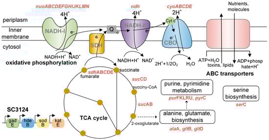 To evaluate the differential gene expression patterns of SC3124 and the WT, clustering analysis was performed on the differentially expressed genes (Figure 2b). Different-colored regions represent different clustering information. Genes with similar colors have similar expression patterns. As shown in Figure 2b, the differential gene expression patterns of SC3124 differed from those of the WT when grown in an acidic environment. In SC3124 at pH 6.0, the expressions of cyo, ndh, nuo, and sdh genes, encoding cytochrome bo oxidase, NADH dehydrogenase II, NADH dehydrogenase I, and succinate dehydrogenase, composed of the electron transport chain during aerobic respiration, and suc genes encoding 2-oxoglutarate decarboxylase and succinyl-CoA synthetase, the key enzymes of the tricarboxylic acid (TCA) cycle, were significantly upregulated (by more than three-fold) at 6 and 24 h compared with those at pH 6.8. In addition, the lysine-dependent AR (LDAR) system gene, cadAB, was upregulated in SC3124 at 6 h (pH 6.0). Compared with pH 6.8, in the WT, the genes involved in four amino-acid-dependent AR systems, including glutamic-acid-dependent AR (GDAR, gadABC, ybaT), arginine-dependent AR (ADAR, adiACY), LDAR (cadABC), and ornithine-dependent AR (ODAR, speF, potE) systems, as well as outer membrane porin genes (phoE, ompF) capable of reducing proton influx in the low pH environment, and chaperone protein genes (hdeA) managing the effects of acid damage in enzyme proteins, were notably upregulated under pH 6.0 at 6 h, while most were downregulated at 24 h. These results indicated different responses between E. coli SC3124 and the WT to mild acid stress.