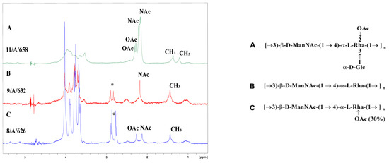 1H HR MAS NMR spectra of A. salmonicida O-polysaccharides: (A) strain 11/A/658 with the new O-polysaccharide structure, (B) strain 9/A/632 with the structure B, and (C) strain 8/A/626 with the structure A. Chart represents A, B, C structures of A. salmonicida O-polysaccharides which have been identified [6]. * impurities from the microextraction step.