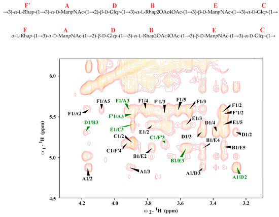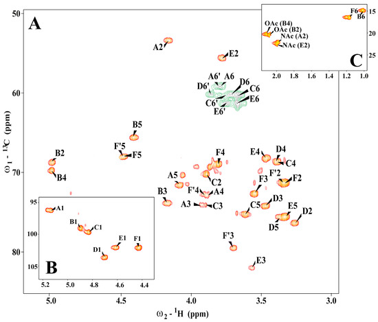 The initial 1H NMR investigation of the A. salmonicida 11/A/658 O-polysaccharide indicated the presence of two N-acetyl (NAc), two O-acetyl (OAc) groups, and two deoxy sugar residues (the presence of CH3 groups). The 1H NMR spectrum of the A. salmonicida 11/A/658 contained the six signals of anomeric protons. The 1H-1H COSY and 1H-1H TOCSY (using different mixing times) allowed for the assignment of the H-1 to H-6,6′ signals for each residue, whereas the 1H-13C HSQC-DEPT spectrum also contained signals for carbons (Table 2, Figure 2).