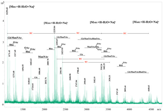 The structure of the repeating unit of A. salmonicida O-polysaccharide 11/A/658 was analyzed by MALDI-TOF MS (Figure 4). The six sugar residues, two ManpNAc, two Glcp, and two Rhap residues, give together a monoisotopic mass of 1106.401 Da (MRU). The ions at m/z 1129.42 Da [MRU + H-H2O + Na]+, at m/z 2235.84 [M2RU + H-H2O + Na]+, at m/z 3342.26 [M3RU + H-H2O + Na]+, and at m/z 4448.63 [M4RU + H-H2O + Na]+ represent the masses of one, two, three, and four complete repeating units, respectively.