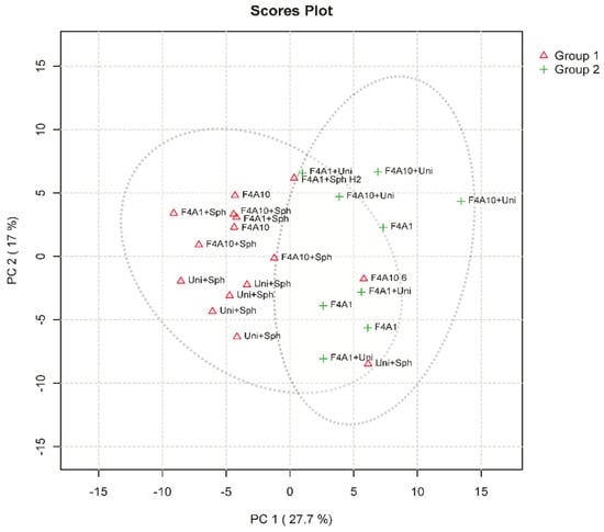 In the PCA analysis, group 1, represented by red triangles, includes the treatments Uni + Sph F4A1 + Sph, F4A10 + Sph, and F4A10, while group 2, represented by green plus symbols, comprises the treatments F4A1, F4A1 + Uni, and F4A10 + Uni. The two groups show a tendency of separation between the groups (Figure 1).