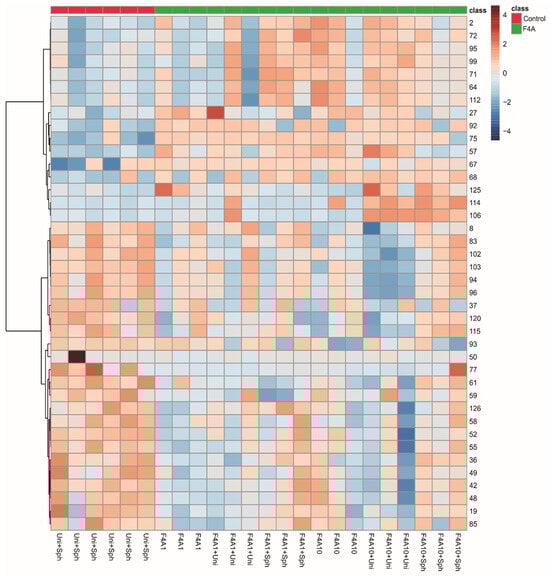 Since the clustering did not show a pattern that could be induced by treatment with F4A, we decided to observe the heatmap grouping the samples as control and treatment with fractions F4A and with the most important 40 peaks (Figure 3). These results indicated higher intensities of O-hexosyl genistein (27), genistein (57), two fatty acid derivatives (125 and 112), and peaks 2, 64, 67, 68, 71, 72, 75, 92, 95, and 99 in all treatments and peaks 106 and 114 in treatments with F4A10 (Figure 2). The samples treated with Uni + Sph show higher intensities of some compounds, such as O-di-deoxyhexosyl kaempferol (19), O-hexosyl-malonyl apigenin (48), O-hexosyl-malonyl genistein (49), O-hexosyl malonyl afrormosin (59), sphingolipid (77), and saponin (85) (Figure 3).