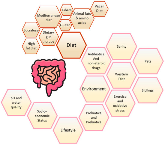 The differences in the diversity and development of the gut microbiota in infants may also be explained by other factors. Among them, home biodiversity (family size and exposure to high levels of endotoxin in house dust) [18], the surrounding environment [19], the presence of siblings and family members [20], the environment while growing up (i.e., urban vs. rural), geographical location/population, and hygienic practices can impact microbial diversity [21]. In a recent study examining the Canadian population, it was reported that there has been a notable increase in IBD intestinal dysbiosis among children aged 0–5 years, while the incidence has remained steady in children aged 6 years and above [22]. Data from Asia and South America also suggest a similar trend, albeit with fewer patients overall [23]. The role of bacteria, fungi, and viruses in the development of IBD has been widely demonstrated and extensively reviewed elsewhere [14]. Moreover, since children are considered the best model to study the pathogenesis of IBD [15], our review aims to provide as much detail as possible in pediatric age. Figure 1 summarizes the potential factors contributing to gut dysbiotic conditions.