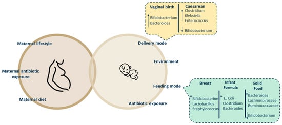 Alterations in infants’ gut microbiota composition during their first year of life are influenced by various factors, and delivery mode and cessation of breastfeeding are two key factors [24,25] (Figure 2). Infants delivered by cesarean section (CS) indeed were found to have abnormal gut microbiota characterized by an increased presence of Clostridium, Clebsiella, and Enterococcus and a decreased presence of Bifidubacterium in respect to vaginally delivered ones [26,27]. One of the possible causes of these alterations in newborns is the need for antibiotic consumption by mothers undergoing cesarean section [28,29]. Moreover, mounting evidence suggests that an irregular gut microbiota composition due to delivery mode influences not only the subsequent regulation of immune response [30] but also may be linked to several clinical conditions [31]. Increased risk of obesity [32], celiac disease, type 1 diabetes [33], and asthma [34] have indeed been reported in children born via CS. This may result from the lack of initial exposure to maternal vaginal and intestinal flora at birth, potentially leaving children vulnerable to various diseases due to alterations in immune system development [35].