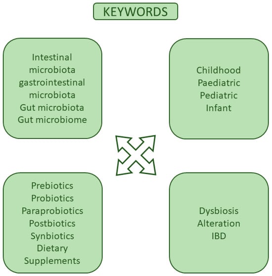 A rigorous electronic search was conducted on well-known scientific databases, including PubMed, Scopus, and Web of Science. The search was limited to the last 10 years, from 2014 to June 2024. The search was performed using a combination of keywords including pediatric, *biotics, and dysbiosis (Figure 4). Boolean operators and filters have been applied to refine and optimize the search results, improving the accuracy and relevance of the results. In a second step, more detailed keywords, for example, SCFAs or butyric acid, were added to the search. The articles were assessed according to the title, abstract, and full text. Additional references were included through meticulous examination of the initially reviewed articles, ensuring broad inclusion of both recent and prior literature. The extracted data were then reviewed and synthesized using a narrative approach, providing a detailed and coherent summary of the current state of the research.