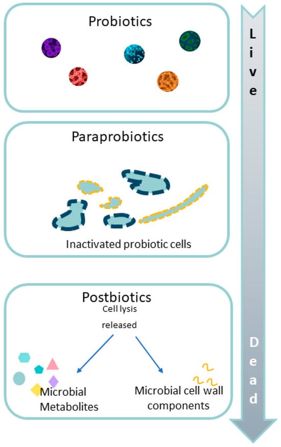 The term probiotics is derived from a Greek word meaning “for life” and is used to define living non-pathogenic organisms and their derived beneficial effects on hosts. The current definition, established by the Food and Agriculture Organization (FAO) and the WHO in 2001 and slightly modified by the International Scientific Association for Probiotics and Prebiotics (ISAPP) in 2014 describes probiotics as “live microorganisms which, when administered in adequate amounts, confer a health benefit on the host” [75]. This emphasizes the viability of microorganisms as crucial for the classification of probiotics (Figure 5).