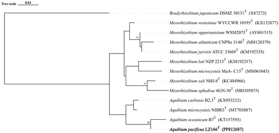 The 16S rRNA gene sequence analysis indicated that LZ166T exhibited the highest sequence similarity of 98.58% with A. oceanicum B7T, followed by A. carbonis B2.7T (97.94%) and A. mycrocysteis NIBR3T (96.71%), which were lower than the cut-off value of 98.65% []. A detailed ML tree (Figure S3) and a concise ML tree (Figure 1) based on the 16S rRNA gene sequences were constructed and both of them clearly revealed that strain LZ166T formed a separate lineage within the genus Aquibium. This topology was further confirmed by the ME (Figure S4) and NJ methods (Figure S5). The collective findings from the 16S rRNA gene phylogeny suggest that strain LZ166T could represent a potential novel species within Aquibium.