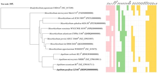 The draft genome sequence of strain LZ166T was utilized to infer its metabolic profiles, which was subsequently compared with those of three other Aquibium species (Figure 2). LZ166T is capable of obtaining carbon from both inorganic and organic sources. A distinctive feature of the LZ166T genome is its potential for carbon dioxide fixation via the Calvin–Benson–Bassham (CBB) cycle. The genome contains a complete set of genes necessary for the CBB cycle, including those encoding key enzymes such as ribulose-1,5-bisphosphate carboxylase (Rubisco) and phosphoribulokinase (PRK) []. The Rubisco enzyme catalyzes the carboxylation of ribulose-1,5-bisphosphate, resulting in the formation of 3-phosphoglycerate []. To date, four forms of Rubisco have been identified, with form I being the most prevalent []. The genome of LZ166T encodes form I RubisCO (RcbL and RcbS), which shows the highest similarity (88.8% and 84.7%, respectively) to the enzymes from Mesorhizobium mediterraneum. Although the rcbL and rcbS genes were predicted in the genome of LZ166T, no complete carbon fixation pathways have been identified in the genomes of the other Aquibium species. This indicates that the rcbL, rcbS, and prk genes may serve as genetic markers to distinguish strain LZ166T from the other members of the genus. The presence of the CBB pathway hints that LZ166T may be capable of autotrophic metabolism. Additionally, the genome of strain LZ166T also encodes the genes involved in the Embden–Meyerhof pathway (EMP), hexose monophosphate pathway (HMP), Entner–Doudoroff pathway (ED), and tricarboxylic acid cycle (TCA), indicating a heterotrophic lifestyle that relies on organic matter for carbon and energy []. Overall, the presence of both carbon fixation and organic matter breakdown genes in the genome of LZ166T suggests a mixotrophic strategy, potentially allowing it to adapt to the dynamic and variable conditions of the marine environment [].