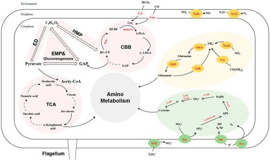 Reconstructed carbon (pink), sulfur (green), and nitrogen (yellow) metabolism of strain LZ166T based on functional genes (corresponding enzymes are in red). ED, Entner–Doudoroff pathway. EMP, Embden–Meyerhof–Parnas pathway. HMP, hexose monophosphate pathway. CBB, Calvin–Benson–Bassham cycle. TCA, tricarboxylic acid cycle. GAP, glyceraldehyde 3–phosphate. RU–5–P, ribulose–5–phosphate. PRK, phosphoribulokinase. RUBP, ribulose–1,5–bisphosphate. RuBisCO, ribulose–1,5–bisphosphate carboxylase/oxygenase. 3–PGA, 3–phosphoglycerate. 1, 3–PGA, 1, 3–diphosphoglycerate. PAPS, phosphoadenosine phosphosulfate. APS, adenosine 5′–phosphosulfate. CA, carbonic anhydrase. Cox, carbon monoxide dehydrogenase. NirK, copper-containing nitrite reductase. NosZ, nitrous oxide reductase. NasD, assimilatory nitrite reductase. GlnA, glutamine synthase. GltB, glutamate synthase. Gdh, glutamate dehydrogenase. Ure, urease. CysK, cysteine synthase. CysI, sulfite reductase (NADPH) hemoprotein beta-component. CysJ, sulfite reductase (NADPH) flavoprotein alpha-component. CysH, PAPS reductase. CysC, adenylylsulfate kinase. CysN, sulfate adenylyltransferase subunit 1. CysD, sulfate adenylyltransferase subunit 2. SOX, thiosulfate oxidation enzymes. Soe sulfite dehydrogenase. Sqr, sulfide:quinone oxidoreductases. Fcc, flavocytochrome c-sulfide dehydrogenase.