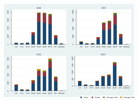 The investigated population with a number of tests performed in each age group represented per year. Prolonged positive individuals were recorded in all age groups. A total of 95.9% of individuals who tested positive had only one positive test result, 4.9% of individuals had between two and four consecutive positive test results (prolonged positive for less than 60 days), and 1.7% of individuals had between five and eight consecutive positive test results (prolonged positive for more than 60 days).