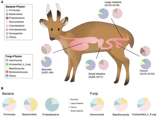 Diagram of gastrointestinal tract sampling of the Chinese muntjac and microbial composition. (A) Pie charts of bacterial and fungal phylum abundance in different in-testinal segments. (B) Pie chart of different intestinal segments in the bacterial and fungal phylum.