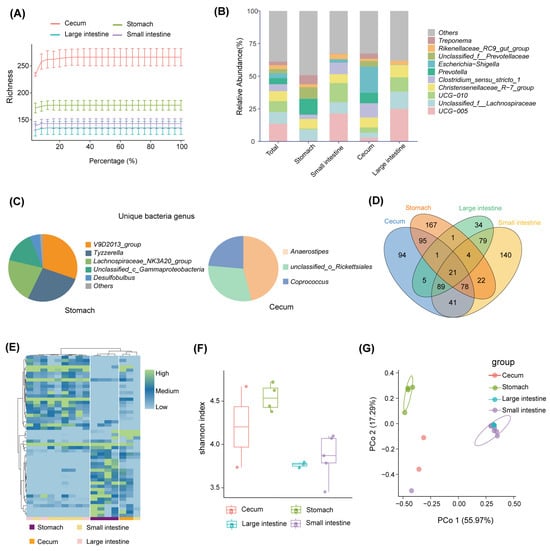 Bacterial diversity of the gastrointestinal tract. (A) Rarefaction curves based on Richness’s index. (B) The bacterial composition of the gastrointestinal tract at the genus level. (C) Unique bacterial genera of the gastrointestinal tract. (D) Venn diagrams of bacterial ASVs in the gastrointestinal tract. (E) Heat map of differential bacterial ASVs in the gastrointestinal tract. (F) Shannon index for bacterial ASVs in the gastrointestinal tract. (G) Principal coordinate analysis of bacterial ASVs in the gastrointestinal tract.