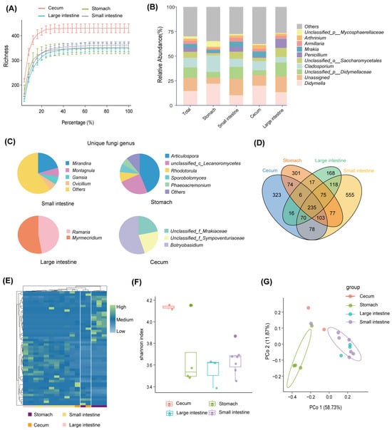 Fungal diversity of the gastrointestinal tract. (A) Rarefaction curves based on Richness’s index. (B) The fungal composition of the gastrointestinal tract at the genus level. (C) Unique fungal genera of the gastrointestinal tract. (D) Venn diagrams of fungal ASVs in the gastrointestinal tract. (E) Heat map of differential fungal ASVs in the gastrointestinal tract. (F) Shannon index for fungal ASVs in the gastrointestinal tract. (G) Principal coordinate analysis of fungal ASVs in the gastrointestinal tract.