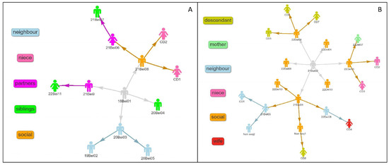 Contact tracing of diagnosed TB patients during TB outbreak: (A,B) show the network of diagnosed TB patients based on traditional field work contact tracing during TB outbreak in the neighborhood. Arrows indicate the most likely source case of infection, suggested by epidemiologic investigation findings. CD = clinical diagnosis; Non-seq = mycobacteria could not be genome sequenced. The figures in grey represent the index patients. Other colors indicate the characteristics of the contact with the source case, as detailed in the legend.
