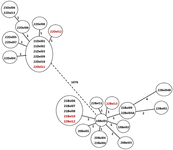 Minimum spanning tree of MTBC isolates relevant to the ongoing epidemiological investigation: The numerical values alongside the lines linking the circles represent the SNP numbers. A cluster of cases is defined when the distance between the isolates in the group is 12 SNPs or fewer. Identical isolates appear in a single circle. The tree shows two clusters, each originating from a different index case. Most of the patients shown in the tree live in the same neighborhood. The patients marked in red were linked to the clusters solely through WGS.