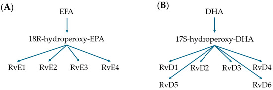 Pathways demonstrating the starting materials of (A) eicosapentaenoic acid (EPA) and (B) docosahexaenoic acid (DHA) and their intermediates in synthesising resolvins.